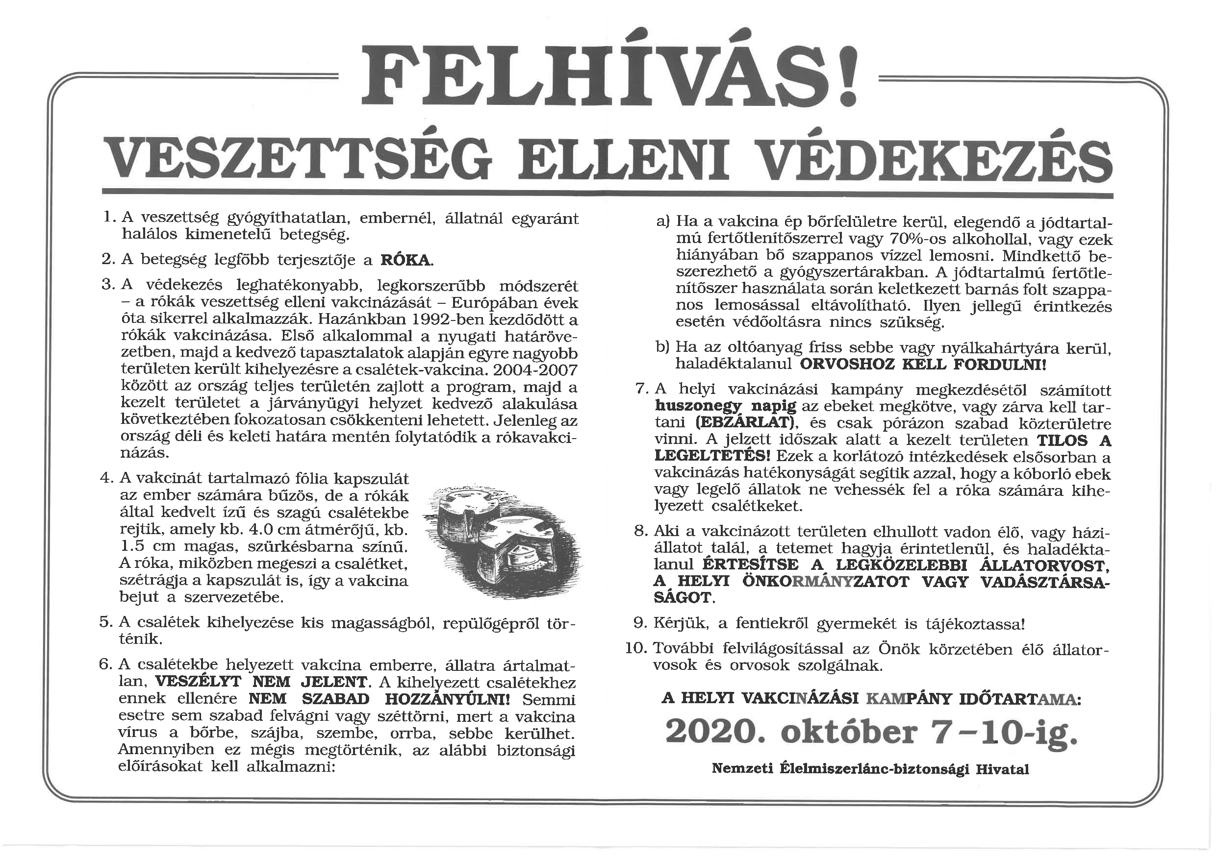 Az Agrárminisztérium élelmiszerlánc-felügyeletért felelős államtitkára a rókák veszettség elleni orális immunizálását rendelte el Tolna megyében 2020. október 07. és október 10. között.