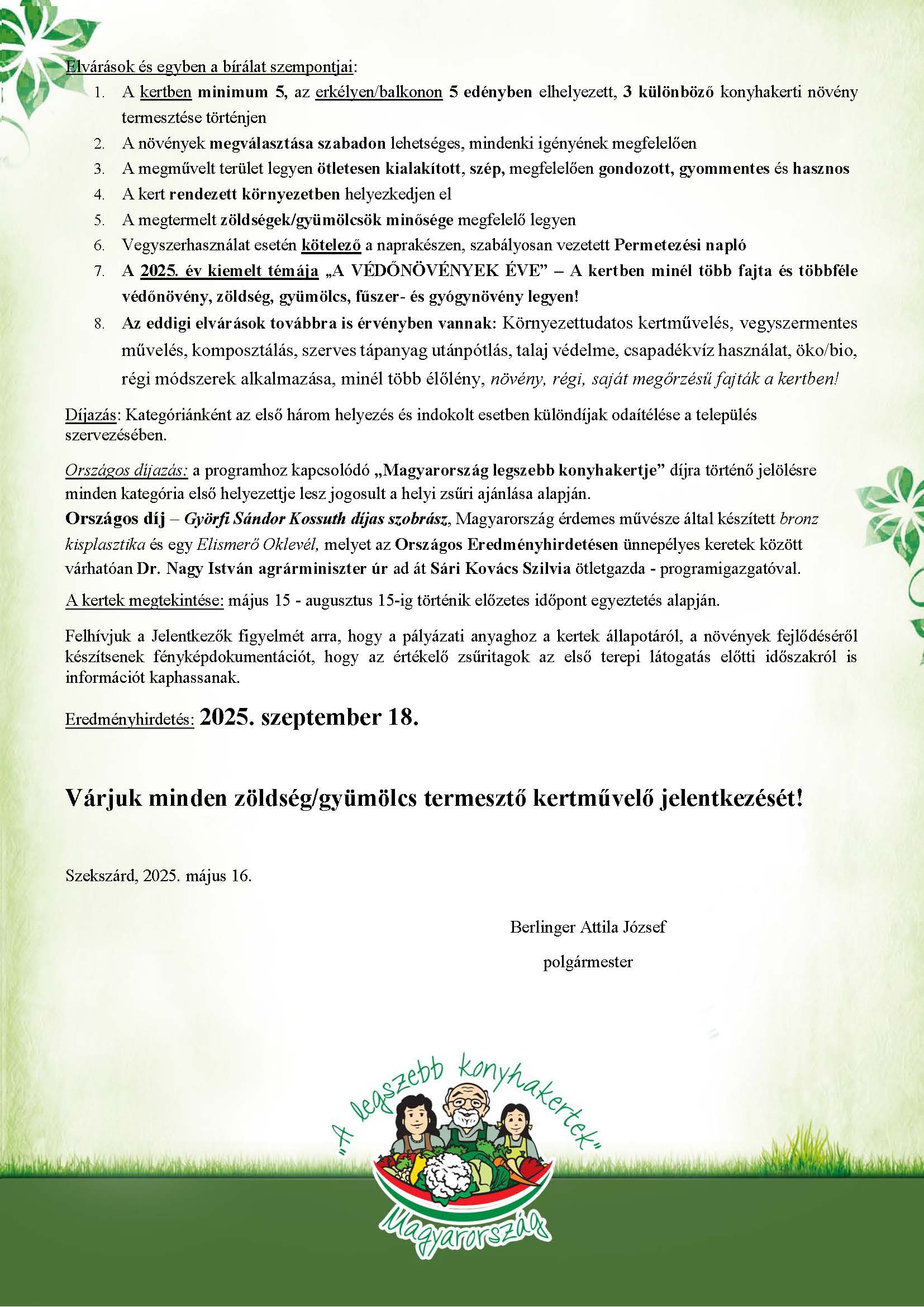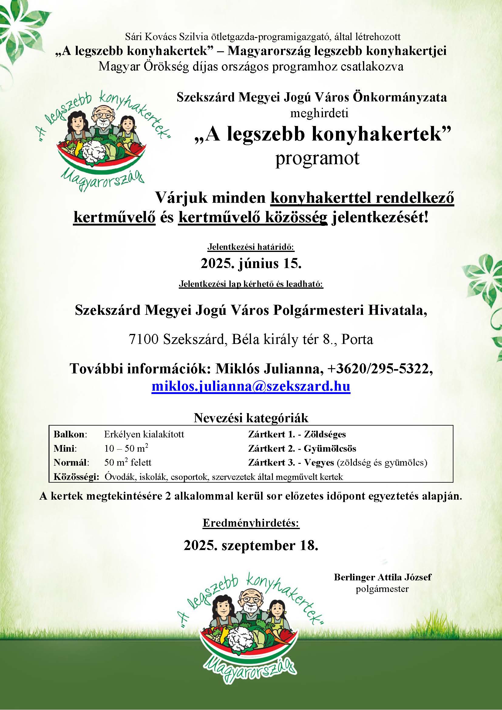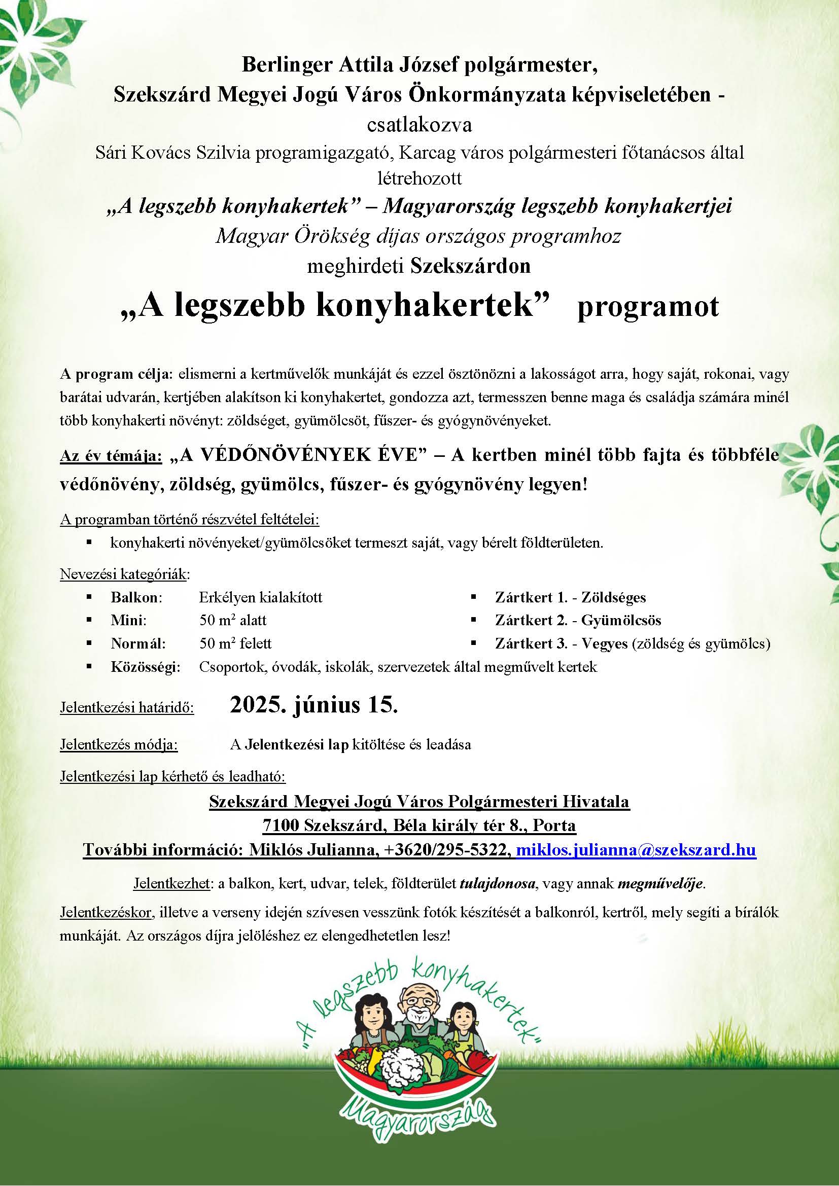 „Szekszárd Megyei Jogú Város Önkormányzata idén is meghirdeti az "A legszebb konyhakertek" programot, csatlakozva a Magyar Örökség-díjas országos programhoz. Az idei felhívás a nevezési kategóriákkal, az év témájával, a bírálati szempontokkal és a díjazás részleteivel a lenti plakátokon olvasható. A jelentkezési lap ide kattintva letölthető.”